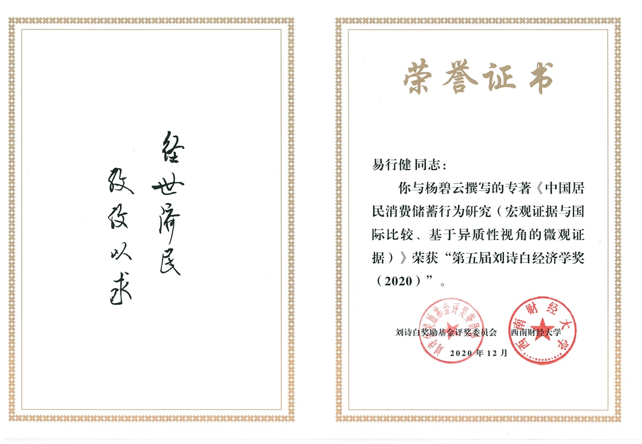 易行健教授的成果《中国居民消费储蓄行为研究》分为《中国居民消费储蓄行为研究——宏观证据与国际比较》和《中国居民消费储蓄行为研究——基于异质性视角的微观证据》两部著作,是国家社科基金重大项目成果,于2018年和2019年分别由人民出版社出版,两部著作合计近80万字,从宏观和微观层面为我国系统制定促进居民消费的经济政策措施提供理论支撑、经验证据、国际借鉴与政策建议,该书研究视角、研究思路与研究体系设计具有较强的创新性与政策意义。