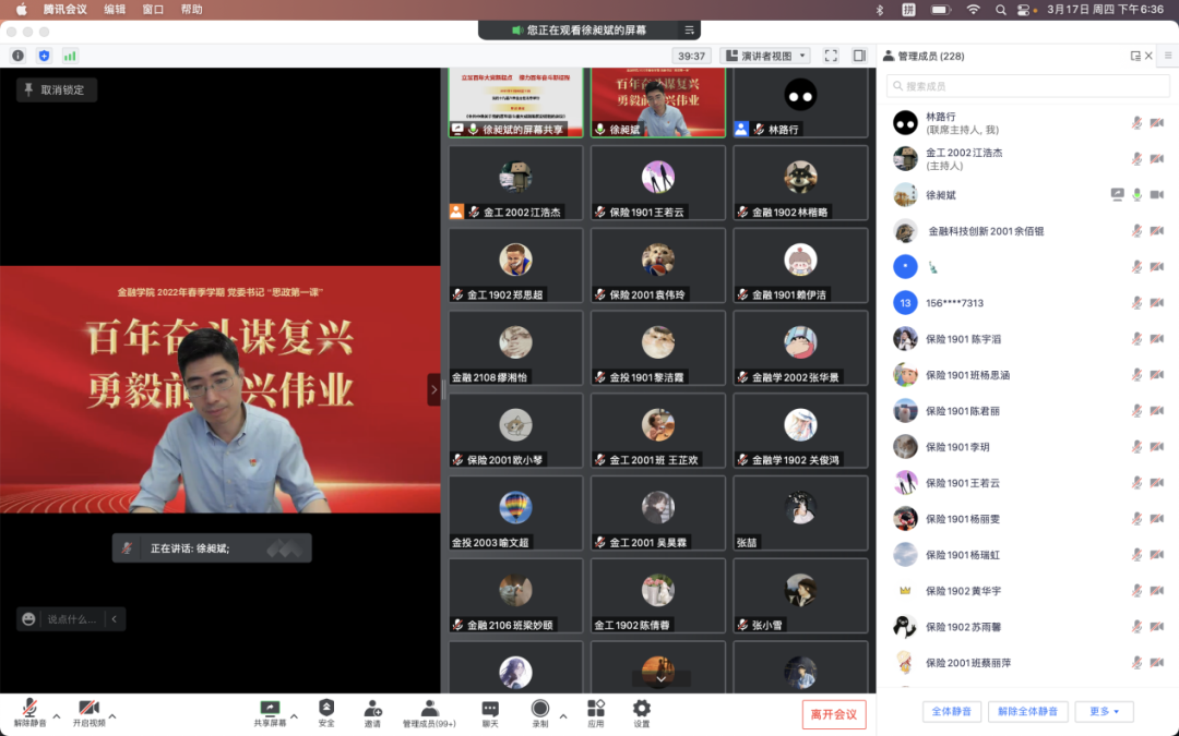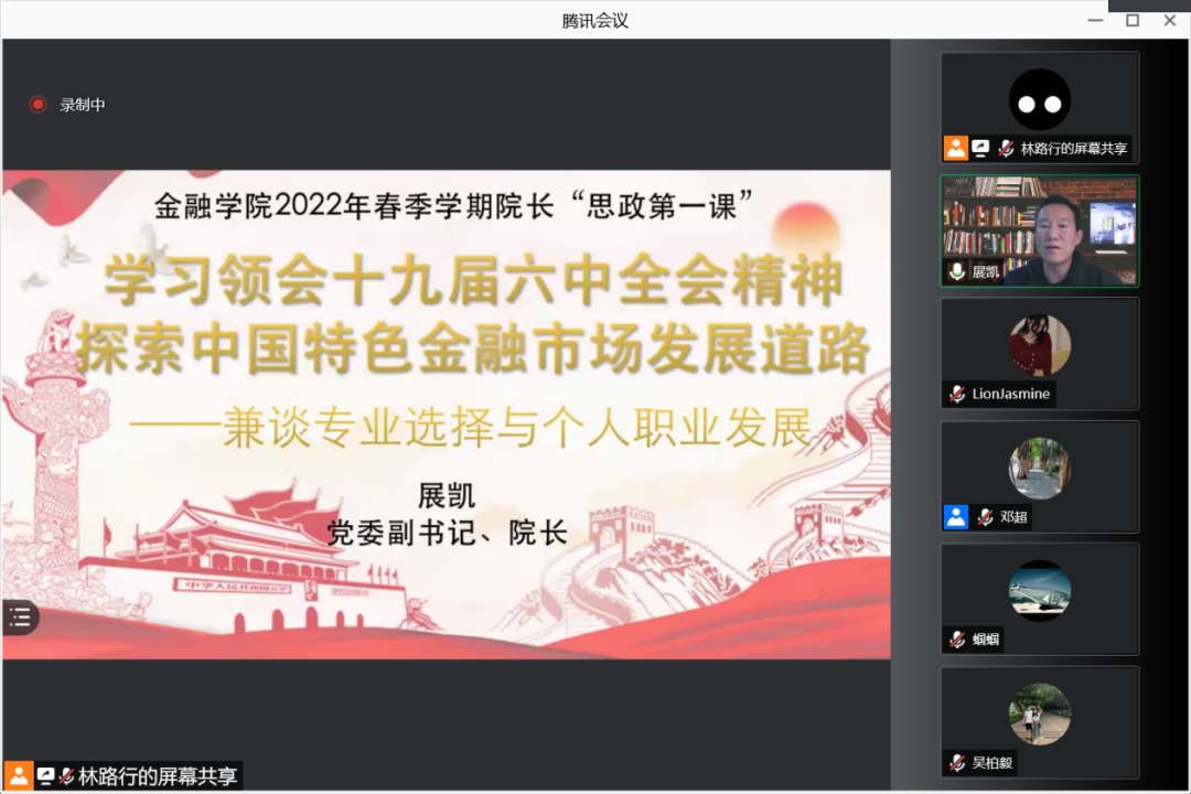 展凯结合十九届六中全会精神与当今国际形势,向同学们阐明了金融话语权的重要性,认为国家近年来大力支持金融界构建新发展格局,建设高水平开放新旗帜,正是凸显出金融行业在国家实力中占据了重要位置。展凯为同学们重点解读了十九届六中全会中有关金融工作的相关内容,“深化金融改革,服务实体经济”为金融工作指明了方向。展凯认为金融人才竞争激烈,鼓励大家考虑深造,推动自身素质全方位提升,注意把金融学习实践与理论素养提升结合起来,努力成长为习近平新时代中国特色社会主义思想的坚定信仰者和忠实实践者,为实现第二个百年奋斗目标、实现中华民族伟大复兴的中国梦而不懈奋斗,以优异成绩迎接党的二十大胜利召开。