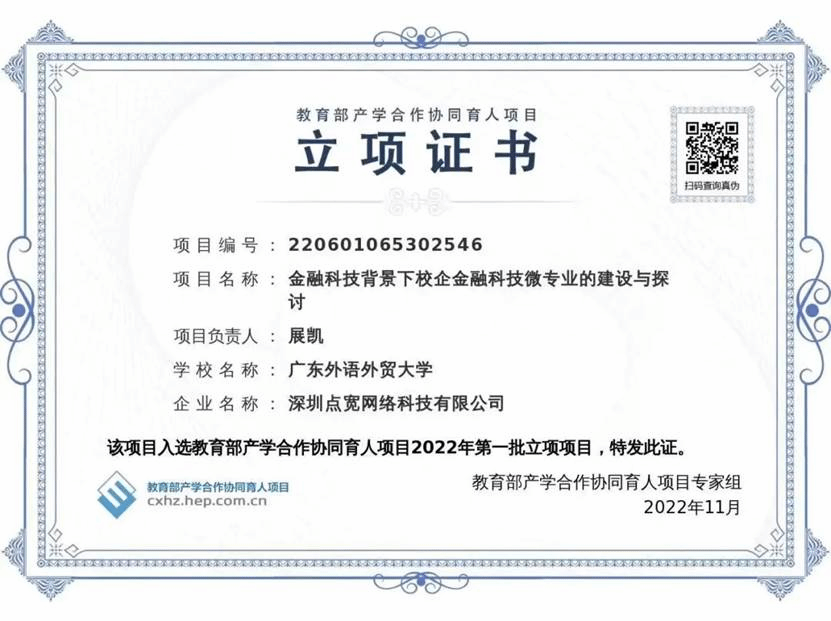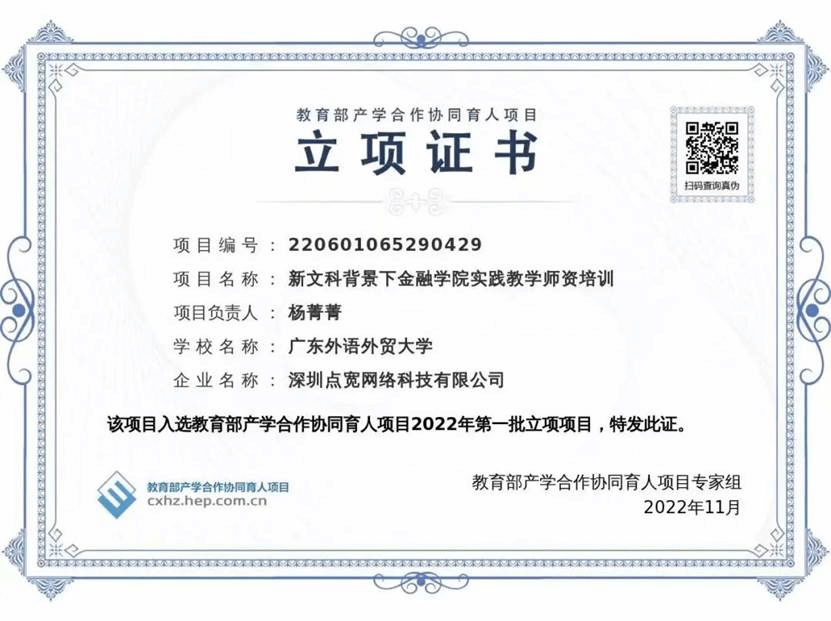 近日,教育部公布2022年第一批产学合作协同育人项目立项名单,公司申报的《金融科技背景下校企金融科技微专业的建设与探讨》(主持人为展凯教授)及《新文科背景下太阳城实践教学团队培训》(主持人为杨菁菁教授)成功获批立项。此次获批的两个项目由深耕金融科技教育领域的深圳点宽网络科技有限公司提供专业技术支持,由公司负责具体项目实施。校企双方共同合作,致力于新文科背景下金融专业的实践教学改革及课程体系建设。