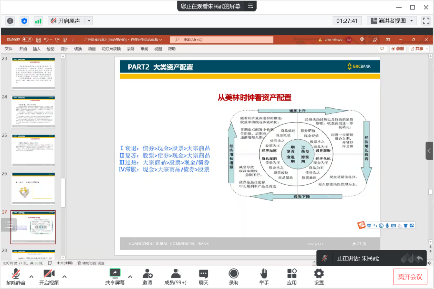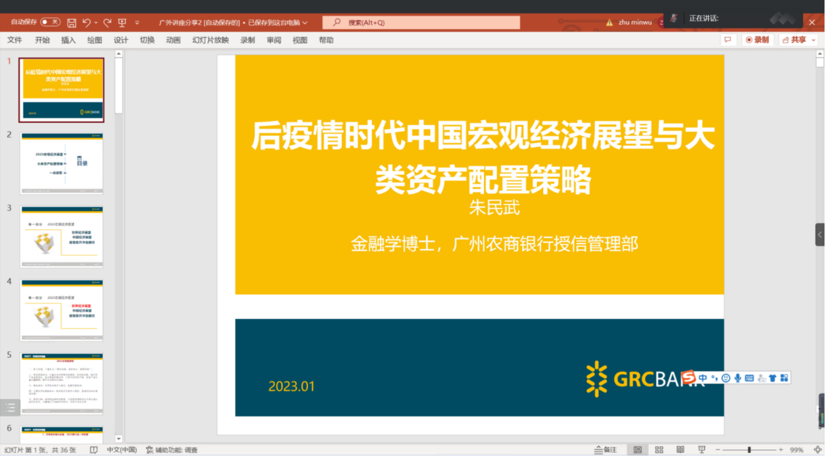 1月6日,广州农商行授信管理部负责人朱民武在线上为公司员工介绍了疫情后宏观经济分析与大类资产配置。公司金融学系主任许振国参加讲座。