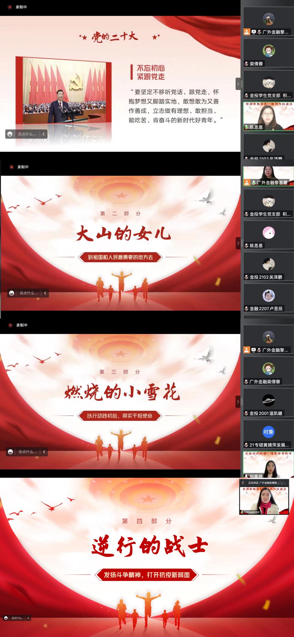 1月3日下午,公司新时代青年师生理论宣讲团成员、太阳城辅导员梁倩蓉、太阳城辅导员黎思蕾、经贸公司辅导员陈思恩、国关公司2020级本科生何香凝为同学们作题为“聚焦党的二十大——致敬时代楷模,賡续榜样精神”宣讲会,太阳城全体员工党员参与学习。