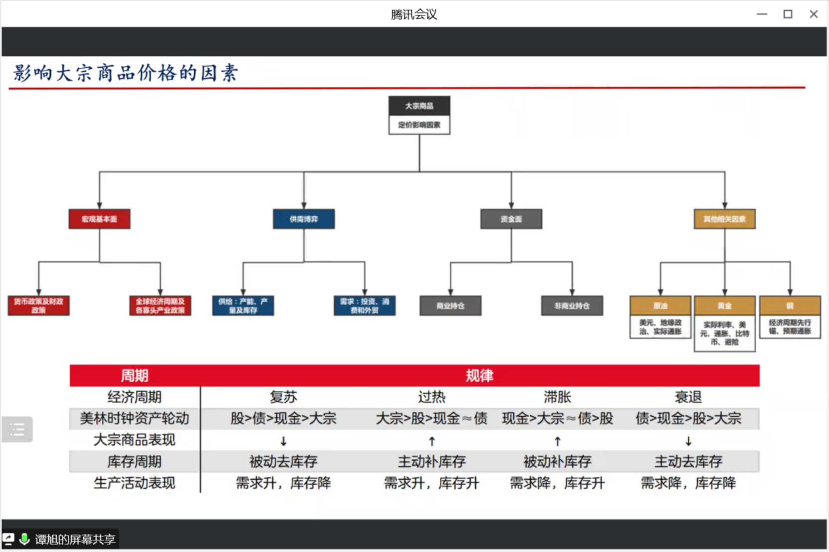 谭旭首先介绍了期货与股票的区别,并对期货市场的现状做了简要介绍。随后,他就套期保值的原理以及多种套期保值方式的运用进行了详细介绍。他以原油为例,介绍了期货市场的分析框架,以及市场主流交易策略包括:趋势策略、套利策略、复合策略、高频策略。最后,他还分享了研究员与交易员的区别,并介绍了多种交易员种类及其对应的交易心理。