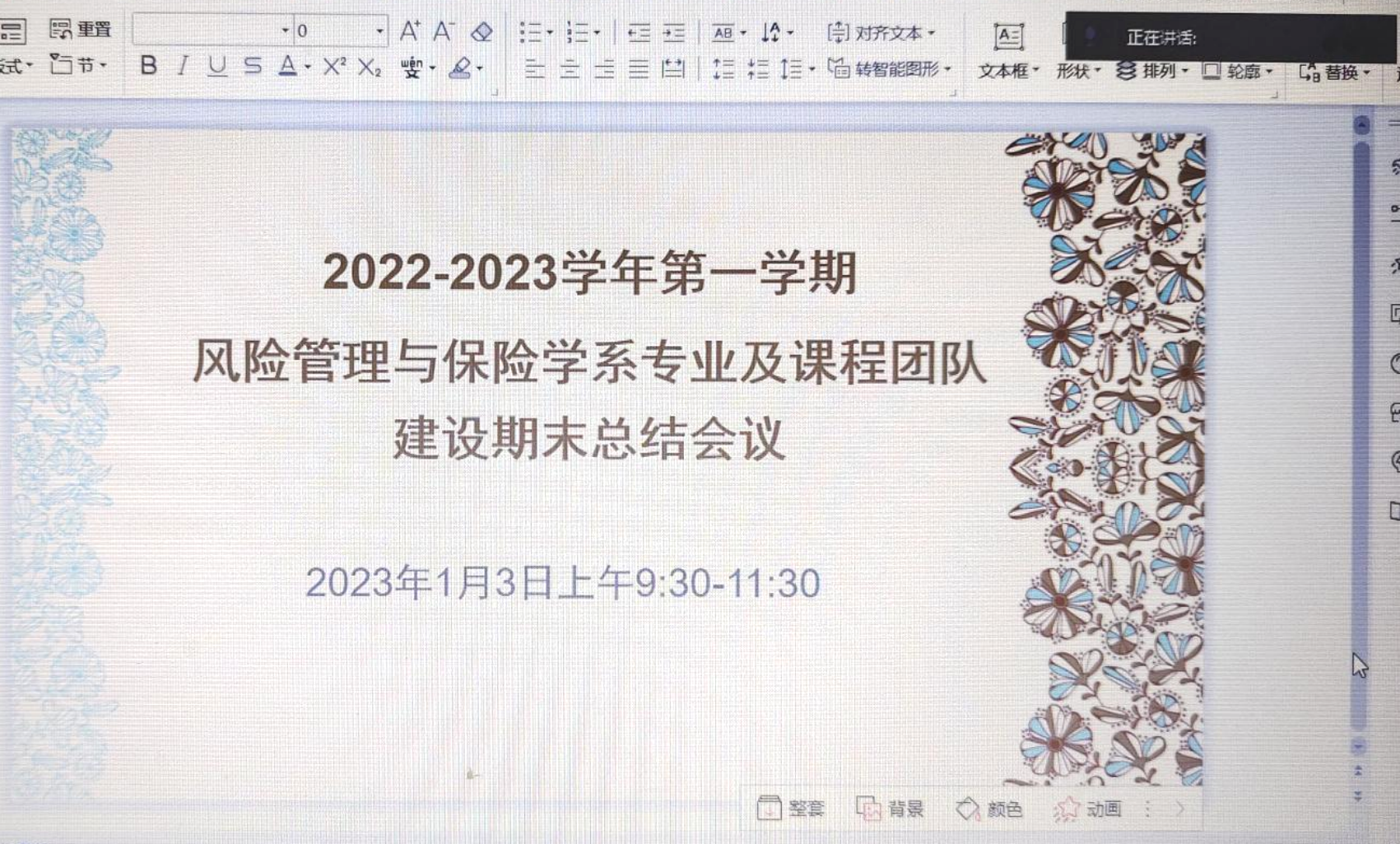 1月3日,风险管理与保险学系在线上召开专业及课程团队建设期末总结会议。会议主要交流了本学期专业及课程团队建设的工作情况,并就下学期需要进一步推进和安排的工作进行部署。对照一流本科专业建设检查自评材料,本学期保险学系主要推进了申报省级教学团队及教研教改项目、签订保险学课程录课合同、建设风险管理课程资料库、参加教师教学创新大赛、指导员工参加学术论坛等工作。下学期将申报省级思政课程、推进保险学课程录制、申报省级实习基地、准备新一轮本科教学评估等。
