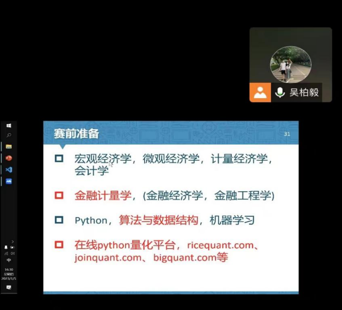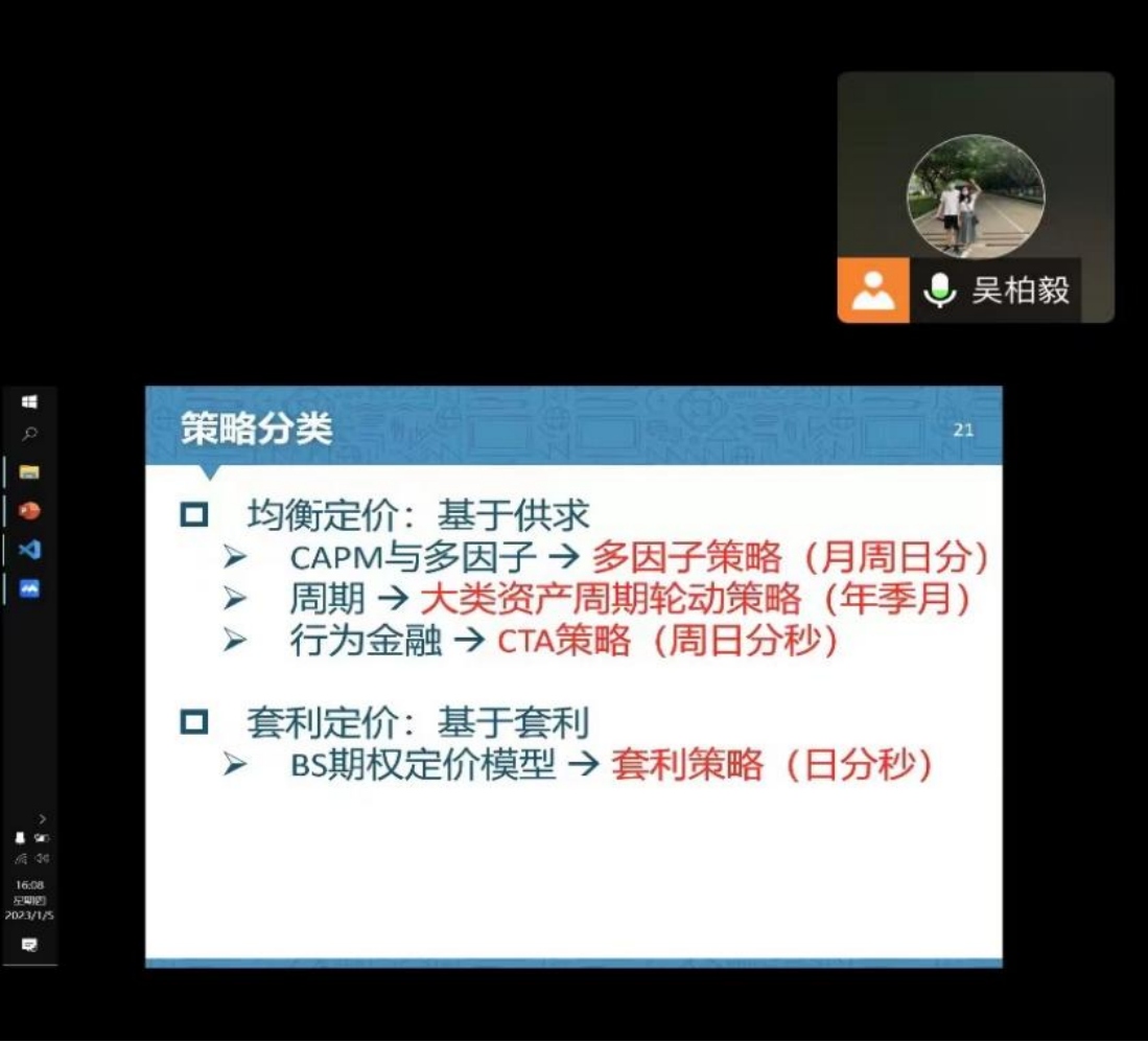 1月5日,太阳城投资与理财系主任吴柏毅在线上分享了量化投资概览与相关比赛的准备。他用通俗的语言介绍了量化投资的基本定义、定价模型、配置模型的功能和分类,以及基于供求平衡的均衡定价模型、基于套利的套利定价模型和均值方差模型等模型。