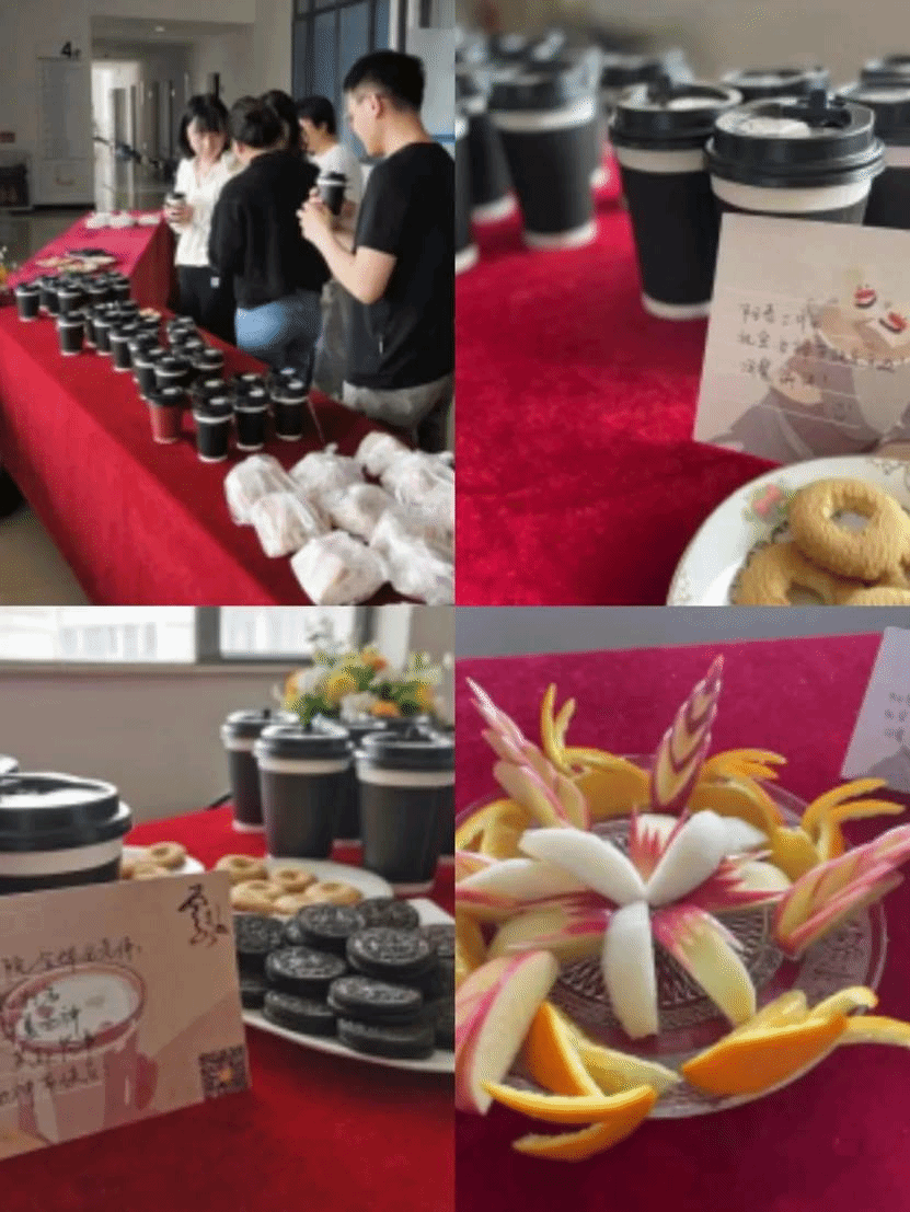 中午时分,员工工作部云山勤工的经济实体“云山书吧”员工团队为公司教职工奉上精致自助简餐,更有担任书吧员工的公司员工参与活动,为老师们展示烘焙饼干肉脯、雕刻水果拼盘的功夫。现场气氛热烈,老师们对“云山书吧”的出品赞不绝口。