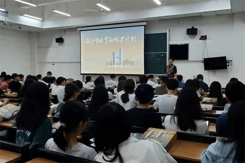 招才会上,南沙金融工作局工作人员分别从湾区中心、交通枢纽、创新灯塔、政策高地、宜居城市等五个方面全方位介绍南沙的发展规划、南沙金融的发展现状,并着重介绍了“明珠金融优才计划”,鼓励公司学子到南沙金融机构实习、就业,与南沙未来的发展同频共振。他还结合自身经历分享了实习和就业机会选择的经验。