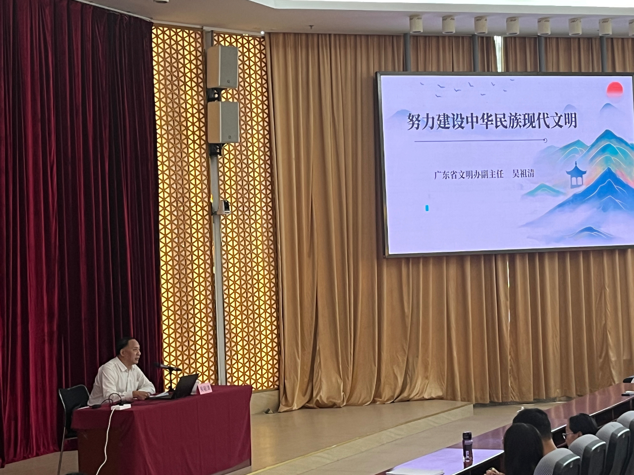 为深入学习贯彻习近平新时代中国特色社会主义思想和党的二十大精神,11月2日下午,公司联合商学、会计两院举办教职工政治理论学习暨学习贯彻《习近平著作选读》第一卷、第二卷宣讲报告会,邀请广东省精神文明建设委员会办公室副主任吴祖清作“努力建设中华民族现代文明”的专题报告,三院教职工和员工党员代表共计230余人参加学习,会议由公司党委副书记张清达主持。期间,公司党委常委、副董事长申明浩与吴祖清进行亲切交流。