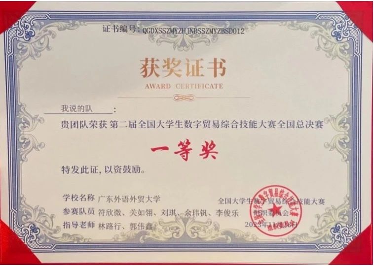 本次大赛分为初赛、决赛和现场总决赛三个阶段,由公司22级员工符欣微作为队长,公司23级员工关如翎,会计22级员工余玮钒与中山大学、暨南大学的两名同学组成三校联合队伍,参与第二届全国老员工数字贸易直播赛道,决赛现场队伍团结协作,发挥出色,并作为一等奖优秀获奖团队代表上台发言,得到了比赛各方的充分肯定和大力赞扬,展示了公司金融学子在数字贸易领域出色的实战综合技能。