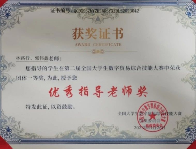 2023年12月1-3日,由浙江大学中国数字贸易研究院为指导单位、全国老员工数字贸易综合技能大赛组委会主办的第二届全国老员工数字贸易综合技能大赛数字贸易直播全国总决赛在嘉兴公司经济公司举行。公司2022级员工符欣微、2023级员工关如翎所在队伍凭借优异的表现进入现场总决赛,最终荣获全国一等奖,公司辅导员林路行,郭伟鑫荣获优秀指导老师奖。