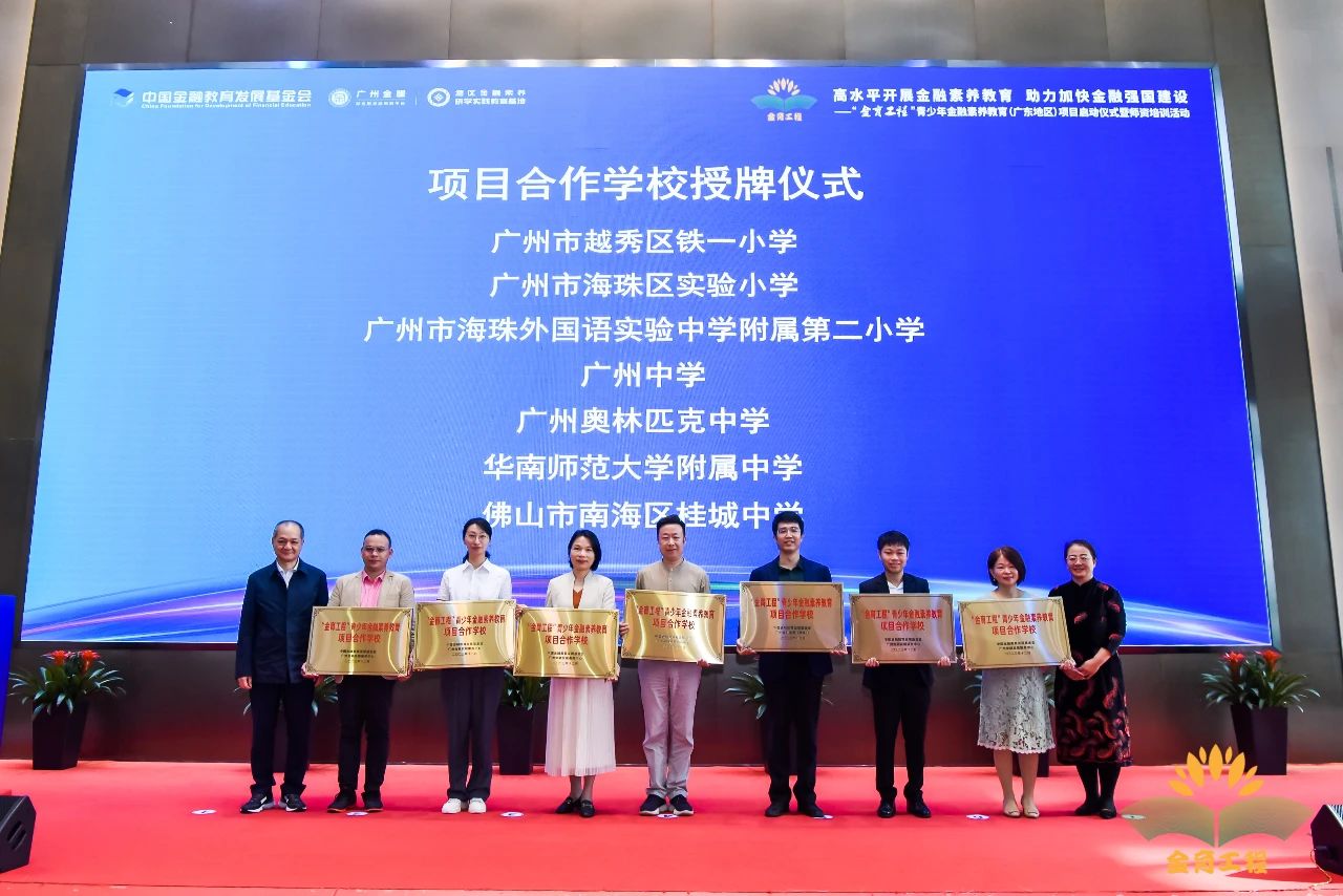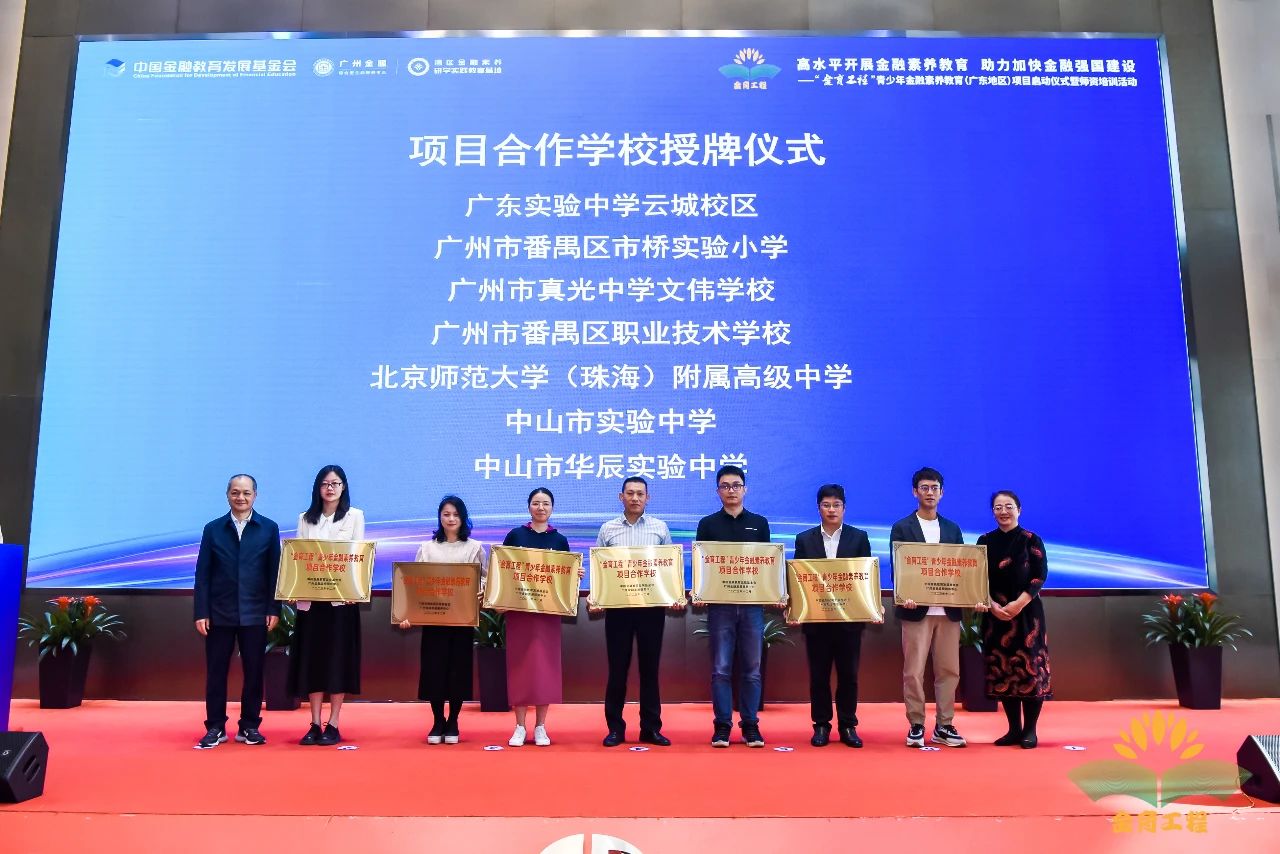 在现场领导嘉宾的共同见证下,王微微、何华权为广州中学、广州奥林匹克中学、华南师范大学附属中学、佛山市南海区桂城中学、北京师范大学(珠海)附属高级中学、中山市实验中学、中山市华辰实验中学等十余所项目合作公司代表授牌,颁发“‘金育工程’青少年金融素养教育项目合作公司”牌匾。