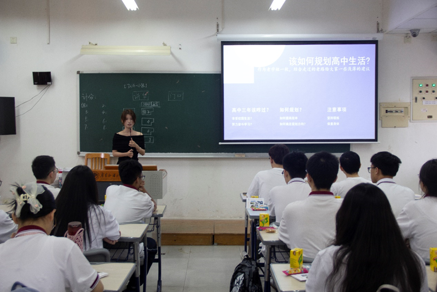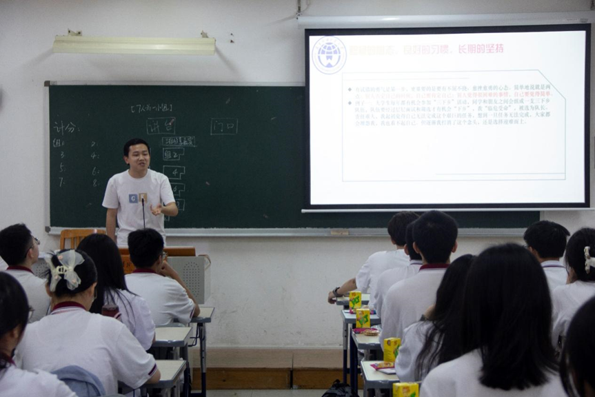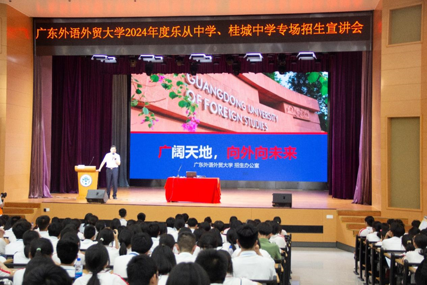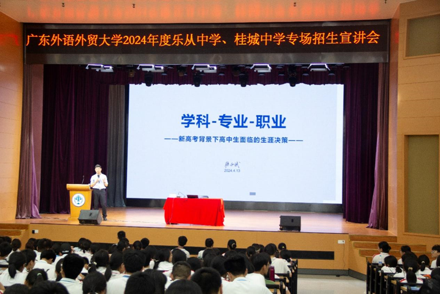 下午,桂中师生(与来自顺德乐从中学的师生共同)在B8学术报告厅参加由招生办主办、国际关系公司承办的招宣专题讲座。公司教务部部长、招生办主任陈金诗配合内容丰富、制作精美的PPT向中学师生全面、深入介绍了广外,着重介绍了学科专业情况并详细解读了招生政策。徐昶斌则以“学科·专业·职业——新高考背景下高中生面临的生涯决策”为题为中员工开展职业生涯规划及高考志愿填报指导讲座,引导大家理性思考高中与高校的衔接,主动探索个人能力个性优势与接下来高考志愿填报、专业选择、职业发展的联动,以期更好地助力个人成长成才。