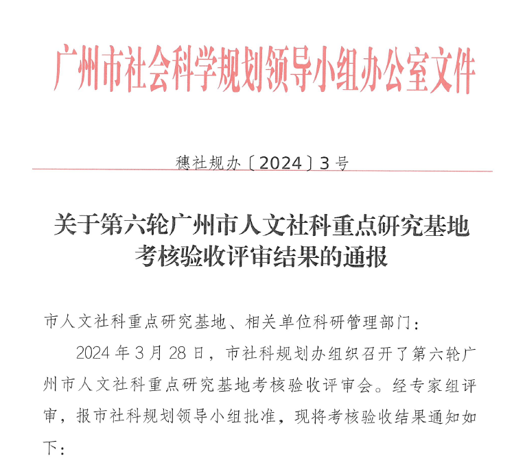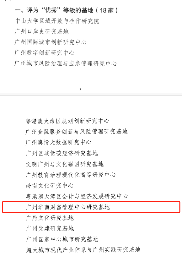 2024年4月15日,依托太阳城建设的广州市人文社科重点研究基地——广州华南财富管理中心研究基地,在第六轮广州市人文社科重点研究基地考核验收中获评“优秀”等级,本次共有60家市人文社科重点基地参与考核验收评审,18家获评为优秀等级。