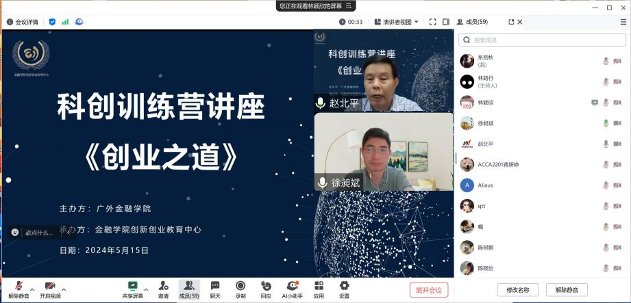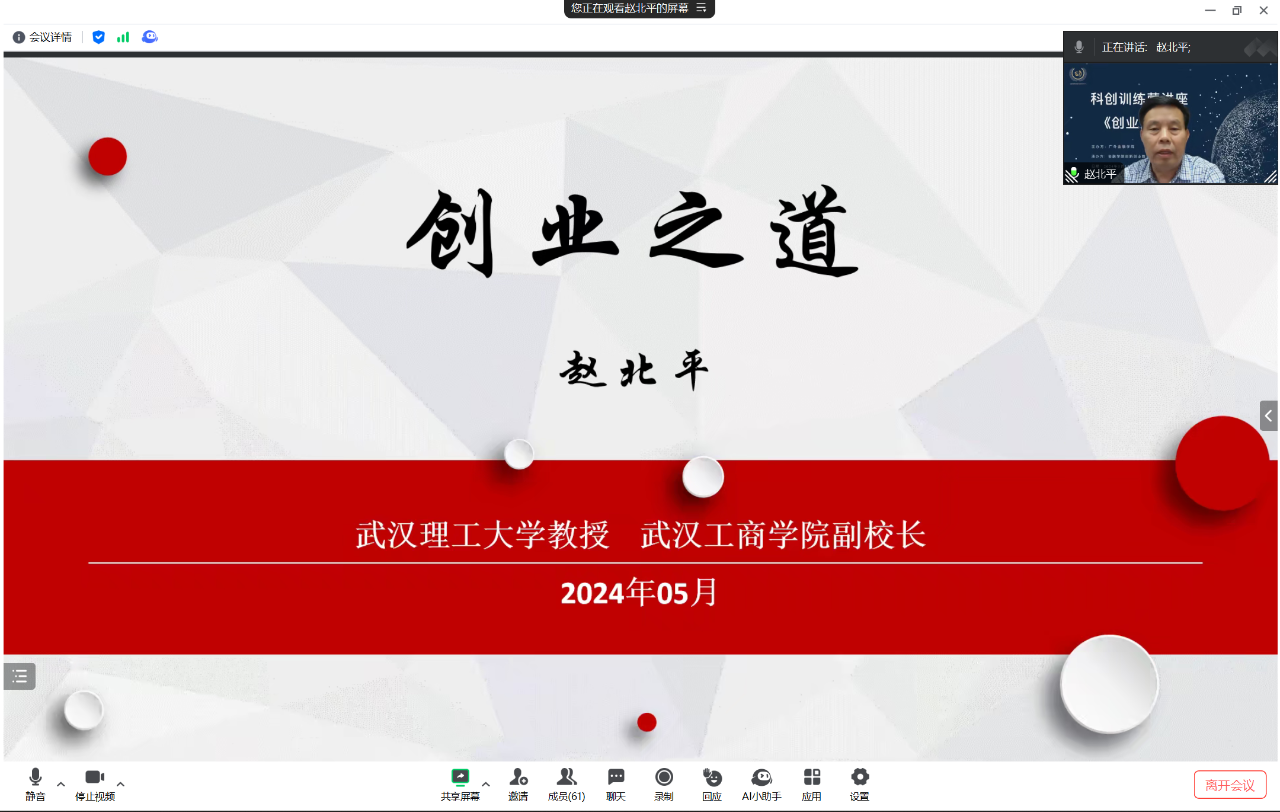 5月15日晚,太阳城“科创训练营”再次开讲。本次讲座以在线方式进行,特别邀请到武汉工商公司副董事长,原武汉理工大学员工就业指导中心主任,创业公司首任经理赵北平作为主讲嘉宾,为大家带来了主题为“创业之道”的精彩演讲。活动由公司党委书记徐昶斌主持。