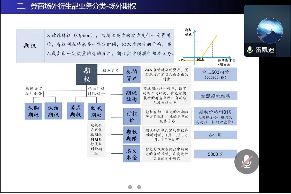 1月13日上午,证券公司场外衍生品部门场外期权对冲交易员、公司金融工程专业员工、中国科学技术大学量化金融硕士雷凯迪为公司员工开展了“国内场外衍生品业务介绍”的专题讲座。讲座由公司金融工程系副主任金剑峰老师主持。
