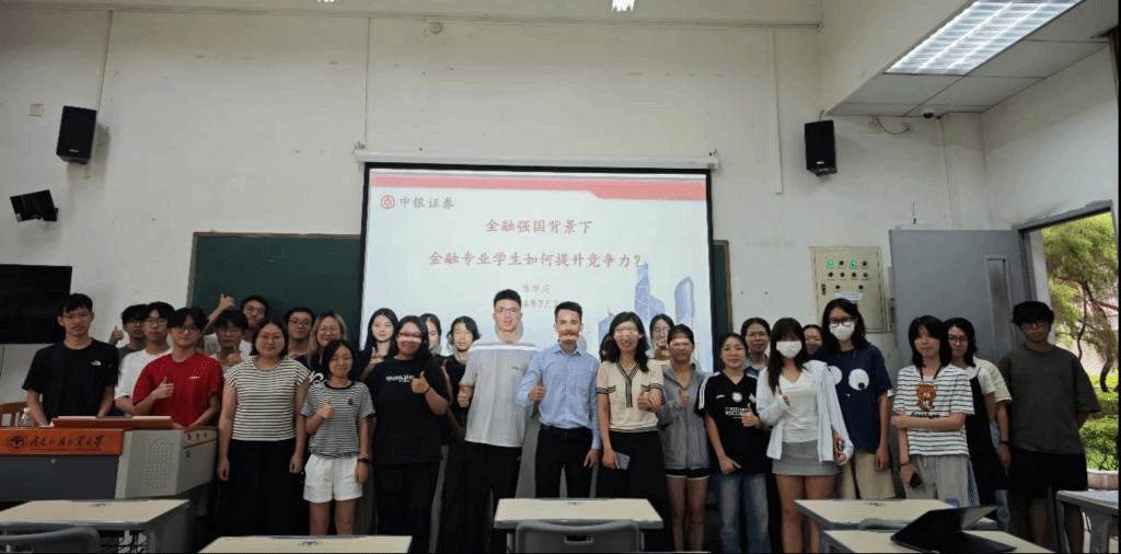 陈华庆总监回顾梳理了中国过往经济与金融的发展历程,展望未来经济与金融的发展方向,帮助同学们找准未来职业规划在整体社会潮流下的定位。同时,讲座针对金融专业员工如何提升竞争力进行了详细的分享与建议,在职业选择、相关资格证书的考取准备、核心技术能力的打造、专才与通才之间的取舍等方面,陈华庆总监结合自身的经历与丰富的教学案例进行了深入的讲解。