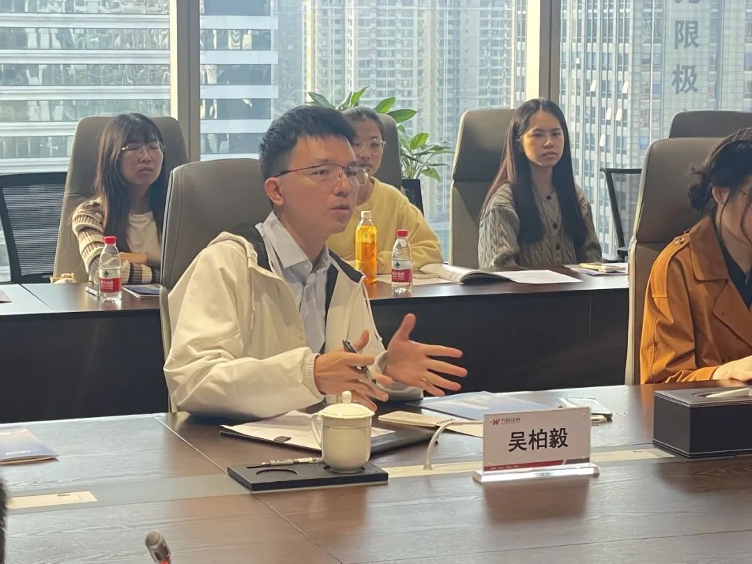 活动伊始,万联证券党委副书记梁伟健与展凯分别致辞,介绍双方的发展历程。随后,万联证券各部门负责人分别进行分享:客群服务部负责人陈然介绍了当前的市场概况并阐述了公司如何通过深入的市场调研和客户需求分析,优化服务流程,提高客户满意度,保持市场竞争力;首席信息官陈卓权和信息技术中心科技金融部经理胡利安分享了万联证券如何运用大数据、人工智能和区块链等前沿技术,提升金融服务的效率与安全性,助力公司在风险管理领域的突破;财富金融产品部高级经理邓嘉田讲解了个性化财富规划的意义,并详细介绍了公司财富管理业务的产品体系和服务内容;人力资源部副总监谭绚分享了万联证券的实习招聘与人才培养计划,讲述了公司如何通过培训、职业发展规划和激励机制,培养优秀的金融人才。广外太阳城师生们也分别就各自的学术研究方向与职业发展规划进行交流,双方展开深入讨论。