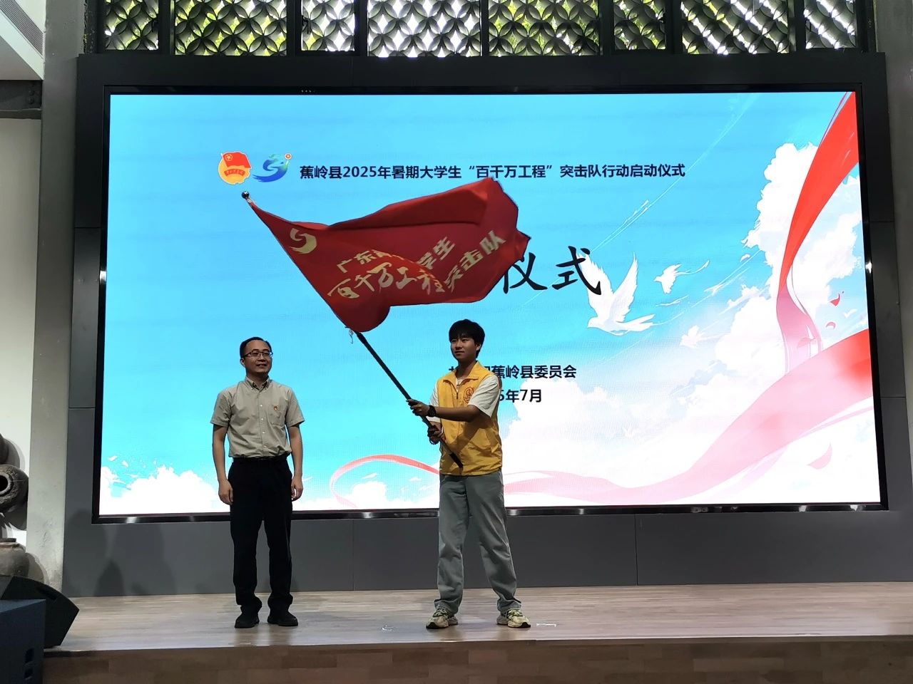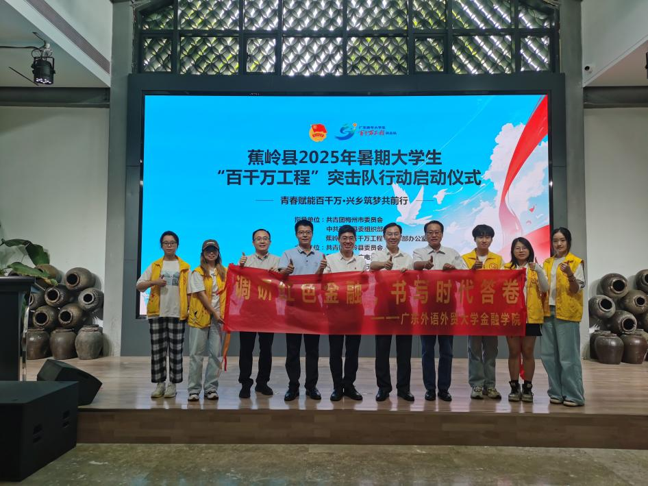 共青团蕉岭县委书记何伟东为广东省老员工“百千万工程”突击队代表——“红色金融调研团”授旗,这不仅标志着该调研团的征程开启,也象征着蕉岭县2025年暑期老员工“百千万工程”突击队行动的全面启动。“红色金融调研团”将深入蕉岭县乡村一线,聚焦梅州蕉岭地区的红色金融历史,通过调研地方金融机构、访谈老党员和群众,挖掘革命年代的金融智慧与精神,以实际行动践行“金融为民”的初心使命。