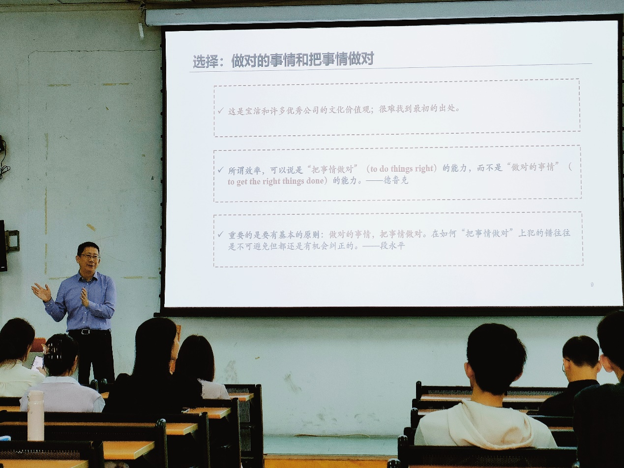袁季(有鱼科技创始人、CEO;广证恒生证券研究所原总经理、首席研究官)开门见山地向同学们强调选择的重要性,“证券分析师对时代的发展趋势应该是敏锐的,因此不仅要做对的事情和把事情做对”。他通过结合生活经历来分析为什么要做“简单而绝不容易”之事,指出抓大放小、逻辑思维和准确表达是三个投研最基本和核心的能力。此外,他对证券分析师个人能力作了简要介绍,并指出人工智能是这个时代最好的礼物,引导同学们正确面对人工智能并熟练掌握它。他也对同学们的人生规划提出了自己的见解,他强调“内卷”的时代要透过现象看本质,大家要忠于自己,脚踏实地去实现梦想。