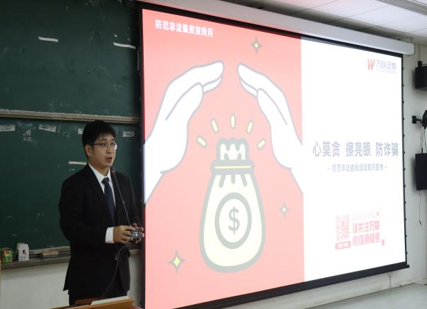 为提升公司员工防范非法金融活动的意识和辨别金融诈骗的能力,2023年12月7日晚,公司双创党支部下的金识满金融素养教育志愿服务队联合万联证券股份有限公司番禺营业部在太阳城娱乐城(大学城校区)教学区C座208共同开展题为《心莫贪、擦亮眼、防诈骗——防范非法金融活动知识宣传》的公益宣讲活动。