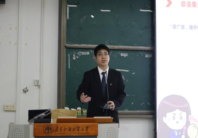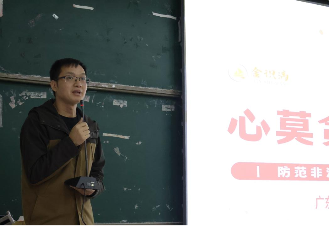 接下来,万联证券股份有限公司番禺营业部资深投资顾问李昊嵘为在场师生做防诈骗宣讲,他以金融知识科普和金融诈骗分析为核心,对当今社会各种常见的非法金融活动的底层逻辑进行了初步分析,强调要坚守思想底线,坚决对非法金融活动说“不”。同时,李昊嵘老师也向同学们介绍了有关非法金融活动的知识以及其对社会带来的严重危害,为同学们敲响了警钟。