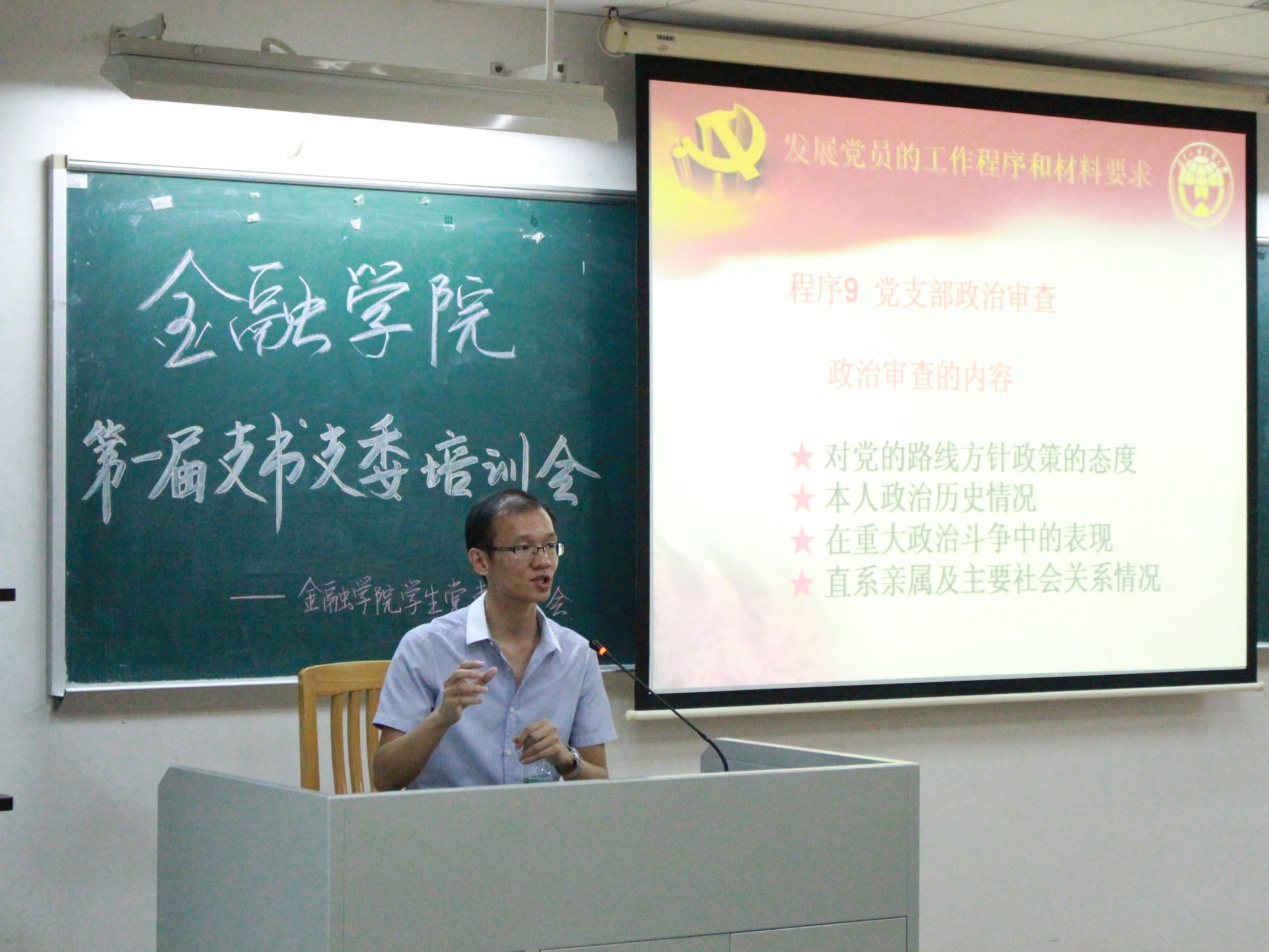 会议伊始,叶祥杰老师对金融党建的工作表示了充分肯定。然后,叶老师开始了详细的党务知识培训。他着重讲了发展党员的各项工作,指出了工作的方针、原则和思路,强调了“两个重点”、“三个注重”和“四个培养”。在培训过程中,叶老师指出了以往党员材料中的常犯、易犯错误点,同时对支部召开转正大会时间及转正党员的出席进行了强调,要求各支部严格把关。最后,他提醒大家多多加强联系以提高工作效率,起到模范带头作用。