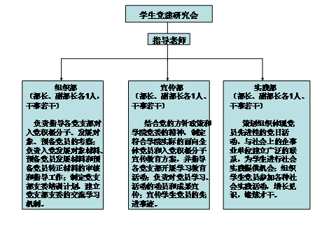 第十条党建研究会设一名指导老师,下设组织部、宣传部和实践部,每个部门设部长和副部长各一名,干事若干,分别指导员工党支部的党员发展、党的理论宣传与学习和党员实践活动等工作。