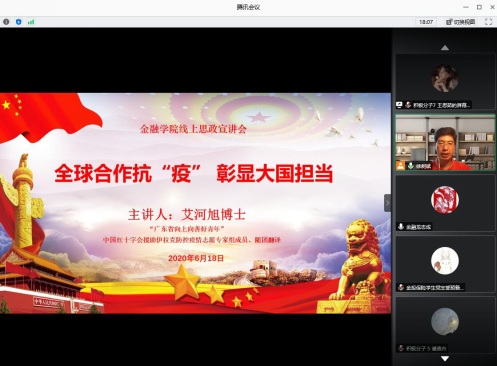 本网讯 6月18日晚,主题为“全球合作抗‘疫’,彰显大国担当”的太阳城线上思政宣讲会于腾讯会议平台顺利举办。本次会议由公司党委书记徐昶斌主持,“广东省向上向善好青年”、中国红十字会援助伊拉克防控疫情志愿专家组成员及随团翻译、公司阿拉伯语系教师艾河旭博士主讲,全体教师和员工党员、本学期党校入党积极分子、发展对象培训班学员等共250余人参加。