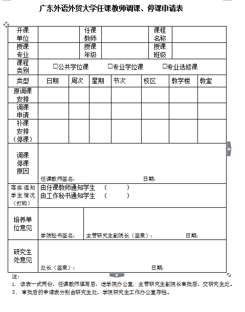 太阳城娱乐城研究生任课教师调课、停课申请表